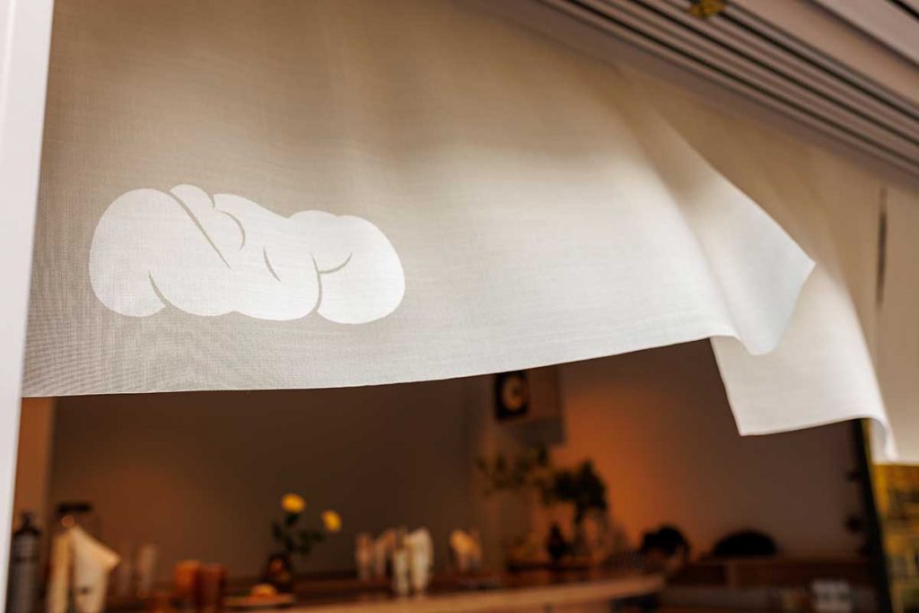 宮城・仙台の青葉区大町、晩翠通沿いの白い外観と淡いグレーの暖簾が目印の“気軽で心地よい立ち飲み酒場”。